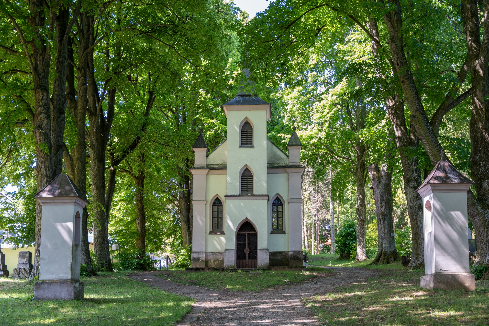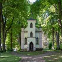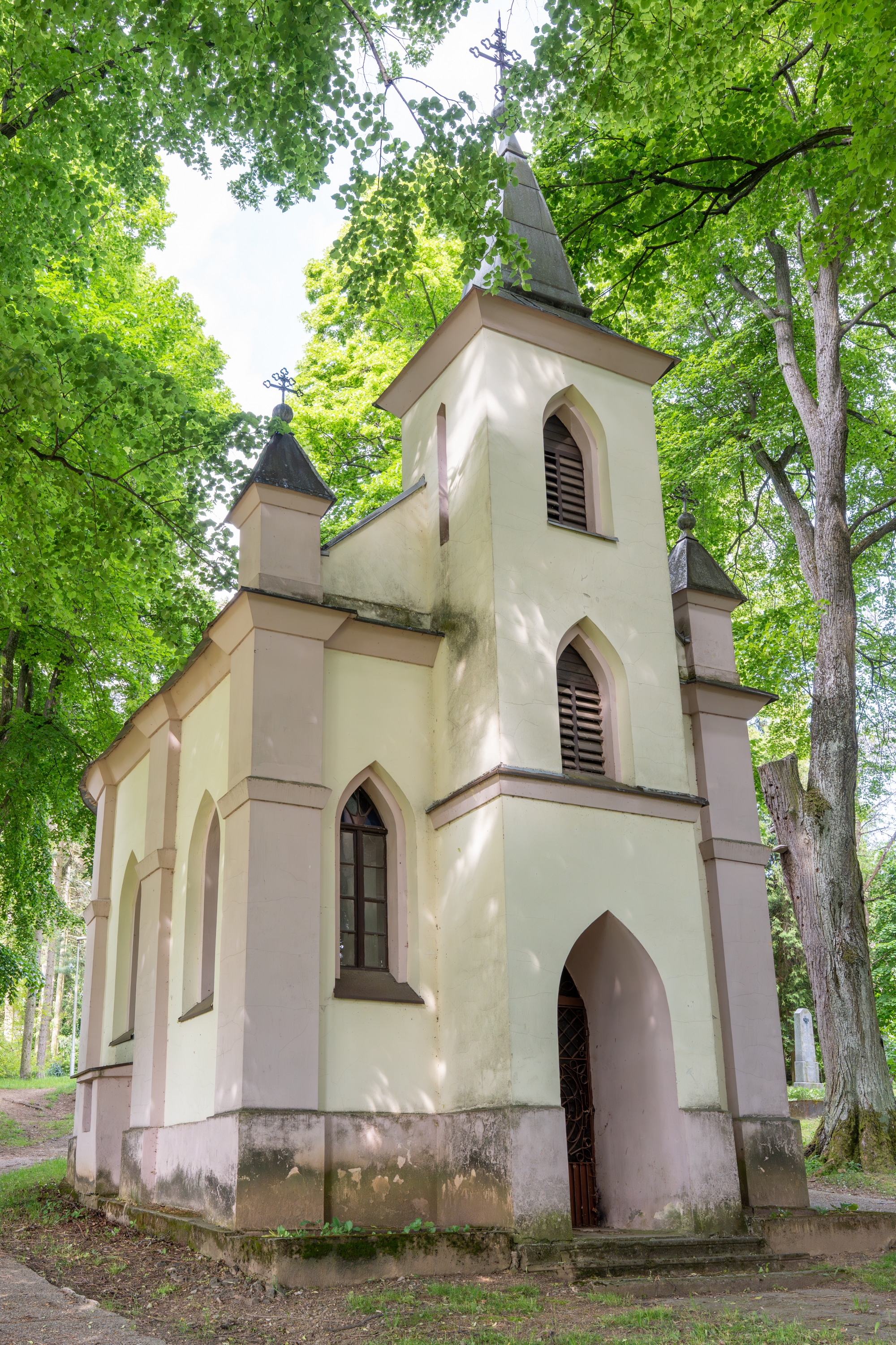 Dominantou celého komplexu je Kaplnka svätého Kríža, ktorá je neogotickou stavbou s polkruhovým záverom. Kaplnka sa vyznačuje prekrásnou fasádou s lomenými oknami, ktoré sú rámované mohutnými pilastrami pripomínajúcimi oporné piliere. Nad priečelím sa vypína veža s ihlancovou strechou, na ktorej vrchole sa týči dvojkríž. V južnej stene kaplnky nájdete náhrobnú dosku Michala Valoviča, ktorý sa zaslúžil o jej vznik. Vstup do kaplnky je zabezpečený dverami z umelecky kovaného železa, ktoré dodávajú miestu osobitý charakter.